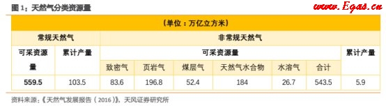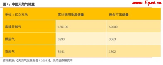 截至2015年底,全國(guó)累計(jì)探明常規(guī)天然氣地質(zhì)儲(chǔ)量13.01萬(wàn)億立方米,剩余可采儲(chǔ)量5.2萬(wàn)億立方米;累計(jì)探明煤層氣地質(zhì)儲(chǔ)量6293億立方米,剩余可采儲(chǔ)量3063億立方米;累計(jì)探明頁(yè)巖氣地質(zhì)儲(chǔ)量5441億立方米,剩余可采儲(chǔ)量1302億立方米。