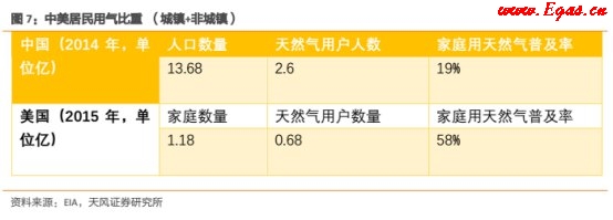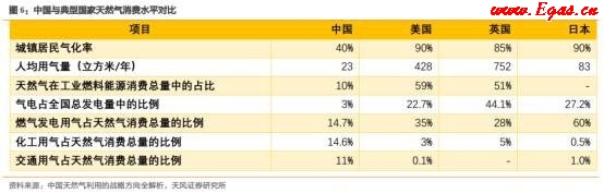居民天然氣消費擁有很大的潛力,因為目前只有小部分城市居民可使用天然氣。根據(jù)國家統(tǒng)計局?jǐn)?shù)據(jù),中國不到20%的人口可使用管道天然氣,而美國的這一數(shù)字達58%。隨著可支配收入和生活水平的提高,越來越多的居民出于便利性和清潔性而傾向于使用管道天然氣。