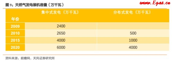 據(jù)中電聯(lián)的《"十三五"天然氣發(fā)電需求預(yù)測》,預(yù)計2020年我國天然氣發(fā)電規(guī)模1億千瓦,其中分布式4000萬千瓦。當(dāng)前我國天然氣分布式能源總裝機容量為500萬千瓦,缺口很大。假設(shè)9F聯(lián)合循環(huán)機組設(shè)備購置加安裝的平均費用為2500元每千瓦,到2020年,集中式天然氣發(fā)電新增市場規(guī)模將達500億元。假設(shè)天然氣分布式發(fā)電設(shè)備購置及安裝費用為3500元每千瓦,到2020年,分布式天然氣發(fā)電設(shè)備新增市場規(guī)模將超過1000億元。