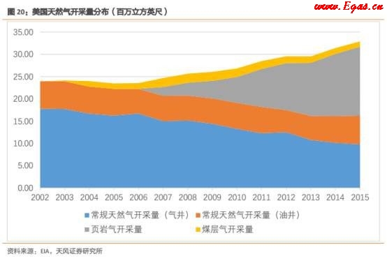 2002年之前,美國非常規(guī)天然氣的產(chǎn)量非常小,幾乎可以忽略。2002年之后,美國常規(guī)天然氣的產(chǎn)量出現(xiàn)了明顯下滑的趨勢。在煤層氣鉆井技術提高和政府財政補貼支持的雙重作用下,美國煤層氣產(chǎn)業(yè)在2002年之后進入了快速發(fā)展期,彌補了常規(guī)天然氣產(chǎn)量下滑的缺口。隨著頁巖氣革命的爆發(fā),2009年美國以6240億立方米的產(chǎn)量首次超過俄羅斯成為世界第一天然氣生產(chǎn)國,頁巖氣的產(chǎn)量快速爆發(fā),產(chǎn)量幾乎與常規(guī)天然氣相當。而煤層氣的產(chǎn)量則逐步穩(wěn)定下來且略有下降。