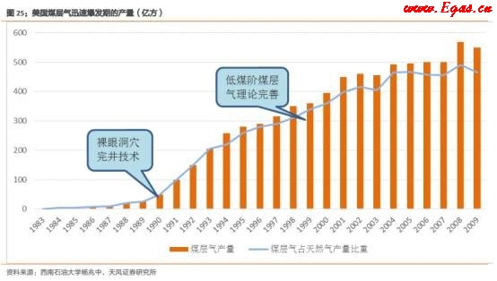 從歷史角度看,美國的頁巖氣產(chǎn)量在取得大突破之前經(jīng)歷了漫長的積淀和等待,僅頁巖氣商業(yè)化開采利用的歷史就有80多年。當然,若不考慮商業(yè)因素,僅考慮生產(chǎn)因素,那么頁巖氣開發(fā)的歷史則更長?,F(xiàn)實當中的"頁巖氣革命"是偶然當中的必然,并非一朝一夕所能完成。而我國煤層氣的開發(fā)是從1980年左右開始的,直至2002年之前,基本處于地質(zhì)尋證,勘探找氣,開發(fā)摸索的階段。