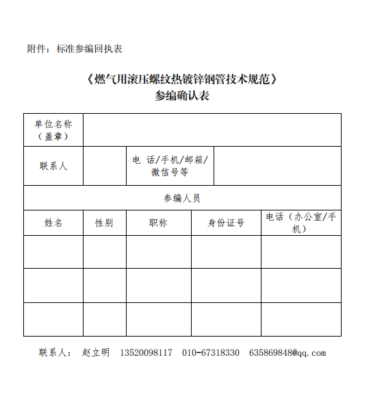 主要內(nèi)容包括:滾壓螺紋技術(shù)壓制外管螺紋的熱鍍鋅鋼管的尺寸、外形、技術(shù)要求、實驗方法、檢驗規(guī)則、包裝、標(biāo)志及質(zhì)量證明書。為使本標(biāo)準更具專業(yè)性和市場適用性,特邀請涉及滾壓螺紋工藝相關(guān)技術(shù)領(lǐng)域單位共同參與本標(biāo)準的制定,請有意向參與的單位填寫附件中回執(zhí)表報名參編工作。