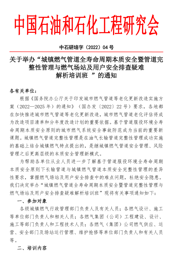 為幫助各單位從業(yè)人員進一步了解基于管道服役環(huán)境全壽命周期本質(zhì)安全原則下長輸管道與城鎮(zhèn)燃氣管道本質(zhì)安全完整性管理的差異性要求,掌握燃氣場站及用戶安全排查中的難點問題,杜絕安全隱患。我們決定舉辦“城鎮(zhèn)燃氣管道全壽命周期本質(zhì)安全暨管道完整性管理與燃氣場站及用戶安全排查疑難解析培訓班”現(xiàn)將有關事項通知如下: