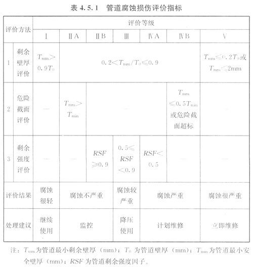 4.5.1管道腐蝕損傷評價的方法應(yīng)符合現(xiàn)行行業(yè)標(biāo)準(zhǔn)《鋼制管道及儲罐腐蝕評價標(biāo)準(zhǔn)埋地鋼質(zhì)管道外腐蝕直接評價》SY/T0087.1的有關(guān)規(guī)定。當(dāng)采用剩余壁厚、危險截面和剩余強度三個層次逐級評價時,管道腐蝕損傷評價指標(biāo)應(yīng)符合表4.5.1的規(guī)定。
