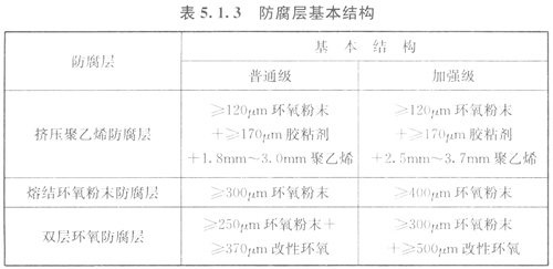 5.1.3管道防腐層宜采用擠壓聚乙烯防腐層、熔結(jié)環(huán)氧粉末防腐層、雙層環(huán)氧防腐層等,普通級和加強級的防腐層基本結(jié)構(gòu)應(yīng)符合表5.1.3的規(guī)定。