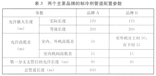 室內(nèi)、外機之間以及室內(nèi)機之間的最大管長與最大高差,是燃氣熱泵空調(diào)系統(tǒng)的重要性能參數(shù),為保證系統(tǒng)運行安全、穩(wěn)定、高效,在設計時,系統(tǒng)的最大管長與最大高差不應超過所選用產(chǎn)品的技術要求。表3列出了兩個主要品牌的相關技術要求。