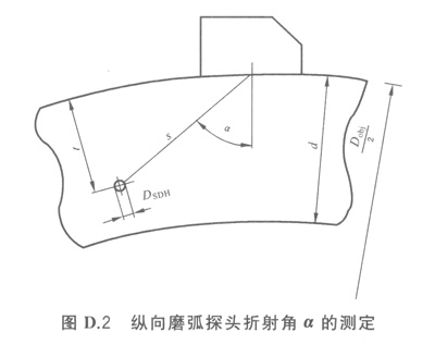 探頭折射角可通過(guò)滿足要求的橫孔最大回波來(lái)測(cè)定,也可在工件、參考試塊或者是在比例圖紙上直接測(cè)定,如圖D.2所示。