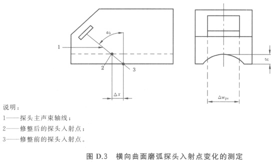橫向曲面磨弧探頭修整后,探頭入射點(diǎn)位置的變化量(Dx)如圖D.3所示。
