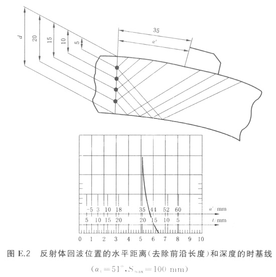 E5.1中闡述的時基線設(shè)置的原理在這里仍適用,但深度和水平距離不再是線性的。非線性標度比例的建立,可在聲程距離比例圖上通過一系列的位置來繪出,或由適當的公式計算出,或可從曲面試塊上得到一系列反射體的最高回波來確定標度,中間值可通過插值法獲得。見圖E.2。