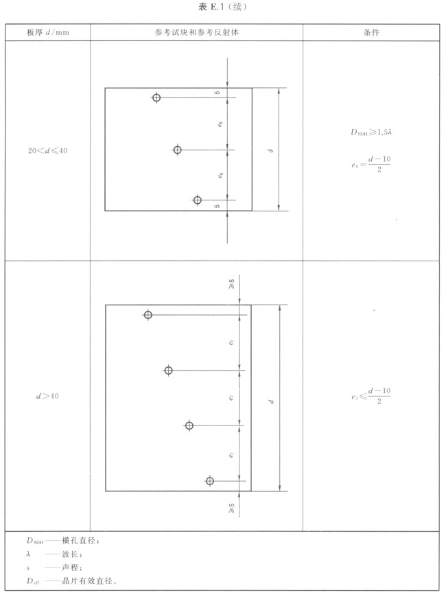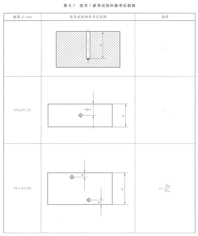 制作DAC曲線所使用的參考試塊,應(yīng)具有一系列不同聲程距離的反射體,且試塊上反射體的深度應(yīng)大于被檢工件的高度。表E.1詳細給出間距、試塊最小尺寸和反射體的具體要求。