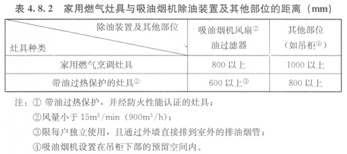 4.8.2家用燃?xì)庠罹吲c上方吸油煙機(jī)除油裝置及其他部位的距離宜按表4.8.2的規(guī)定執(zhí)行,家用燃?xì)庠罹吲c側(cè)吸式吸油煙機(jī)除油裝置的距離可按本規(guī)程第4.8.1條的規(guī)定執(zhí)行。