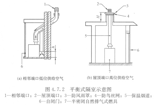 4.7.1當(dāng)半密閉自然排氣式燃具安裝部位臨近較高建筑或用氣建筑較高造成煙道過長(zhǎng)無法安裝時(shí),或用戶需要的燃具熱負(fù)荷大于35kW時(shí),可設(shè)置平衡式隔室,并將半密閉自然排氣式燃具安裝在平衡式隔室內(nèi)。