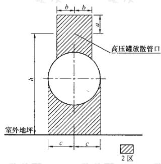 以?xún)?chǔ)罐安全放散閥放散管管口為中心,當(dāng)管口高度h距地坪大于4.5m時(shí),半徑b為3m,頂部距管口a為5m(當(dāng)管口高度h距地坪小于等于4.5m時(shí),半徑b為5m,頂部距管口a為7.5m)以及管口到地坪以上的范圍為2區(qū)。