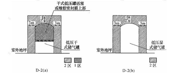 干式儲(chǔ)氣罐內(nèi)部活塞或橡膠密封膜以上的空間為1區(qū)。