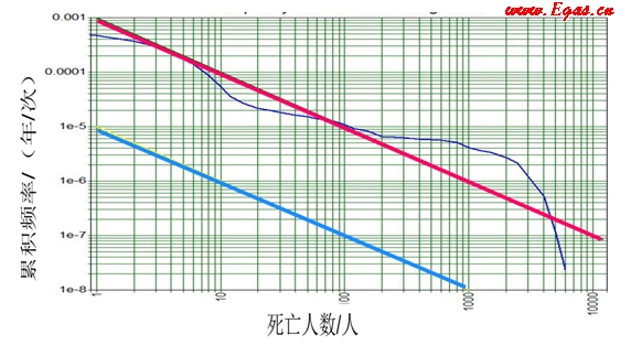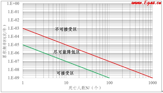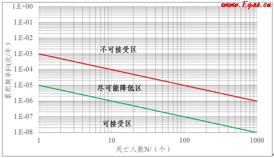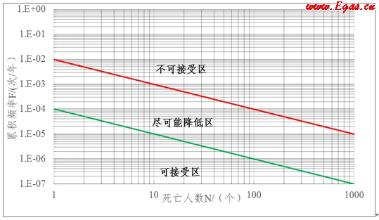 綜合考慮,我國采用香港地區(qū)的社會(huì)可接受風(fēng)險(xiǎn)標(biāo)準(zhǔn)值,作為個(gè)人可接受風(fēng)險(xiǎn)標(biāo)準(zhǔn)的補(bǔ)充對危險(xiǎn)源造成群死群傷事故風(fēng)險(xiǎn)的可接受程度進(jìn)行評估。