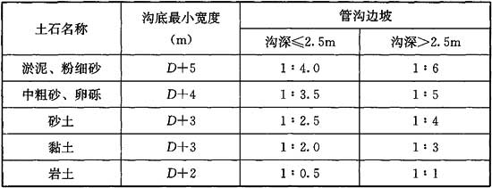 注:1 當(dāng)遇流砂時,溝底寬度和邊坡數(shù)據(jù)應(yīng)根據(jù)施工方案另行確定;