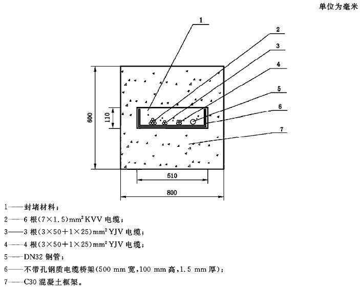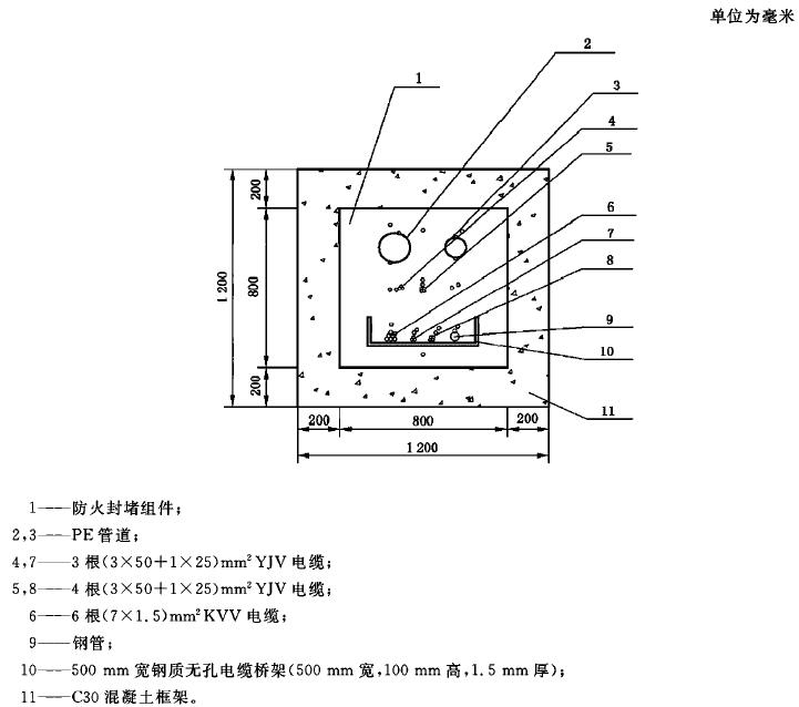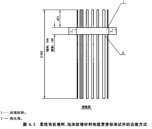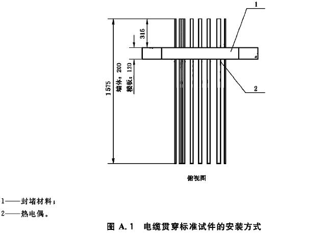A.10 在電纜貫穿標(biāo)準(zhǔn)試件和防火封堵組件標(biāo)準(zhǔn)試件的防火封堵材料表面,距離每種貫穿物25mm處各布置一支熱電偶。在每種貫穿物表面距背火面25mm處布置一支熱電偶。當(dāng)貫穿物背火面作了絕熱處理或有涂層時,在貫穿物上距離絕熱層或涂層邊緣25mm處布置熱電偶。其他任何可疑點均可設(shè)置熱電偶。