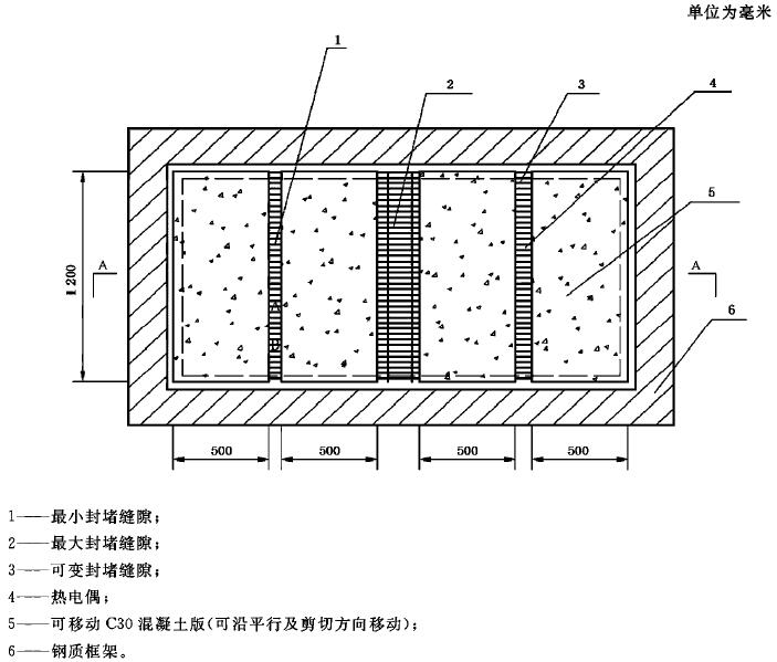 A.7 框架內(nèi)用于支撐縫隙的板材為C30混凝土板(砼板受火面保護(hù)層厚度為10mm)。對于縫隙封堵材料,可根據(jù)委托方的要求,在實施耐火試驗前或試驗過程中采用機械的方式移動縫隙,移動方式可以是沿被支撐的平面移動縫隙的寬度,也可以是沿剪切方向或其他方向移動,移動的最大距離應(yīng)根據(jù)縫隙封堵材料的性能由委托方確定。