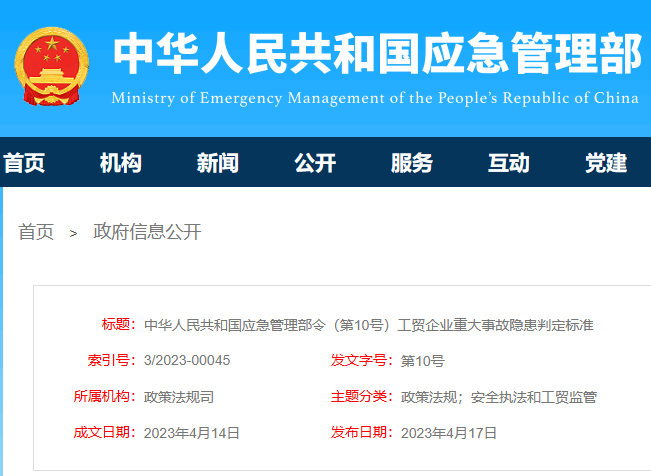 《工貿(mào)企業(yè)重大事故隱患判定標(biāo)準(zhǔn)》已經(jīng)2023年3月20日應(yīng)急管理部第7次部務(wù)會(huì)議審議通過,現(xiàn)予公布,自2023年5月15日起施行。