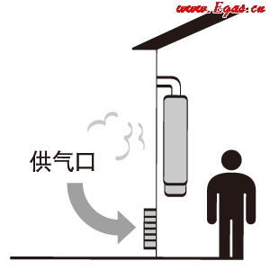 • ① 確保安裝場所留有大于130cm²面積的進、排氣窗口。進、排氣口分別設在接近地面和天花板的位置,并能夠與戶外直接連通。進氣口應盡可能遠離器具的排煙管,防止煙氣倒流到安裝器具的房間內。