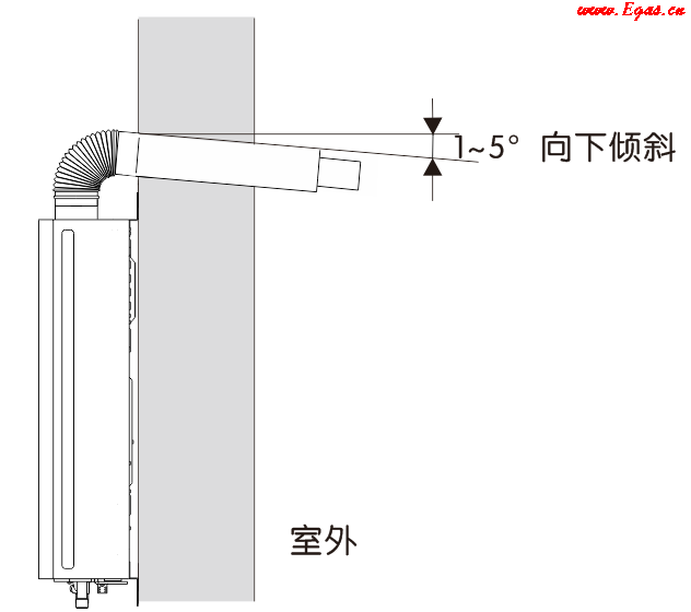 • ⑤ 排煙管應有朝外向下1~5°的角度,以利于冷凝水流出;通過可燃墻壁時,應有≥20mm厚度絕緣材料分隔及覆蓋;