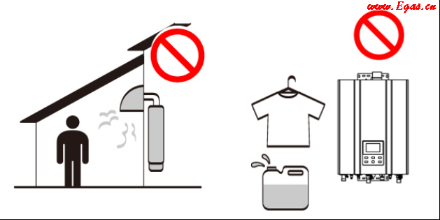 • ④ 安裝前確認熱水器安裝的場所具有良好的通風換氣效果,附近無易燃易爆及腐蝕性的危險品;