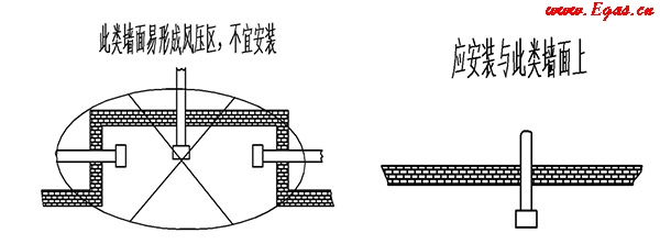 • ③ 排煙口不得安裝在樓房的換氣風道或公共煙道上;排煙孔位置應避開墻面易形成正壓區(qū)的凹形區(qū)。