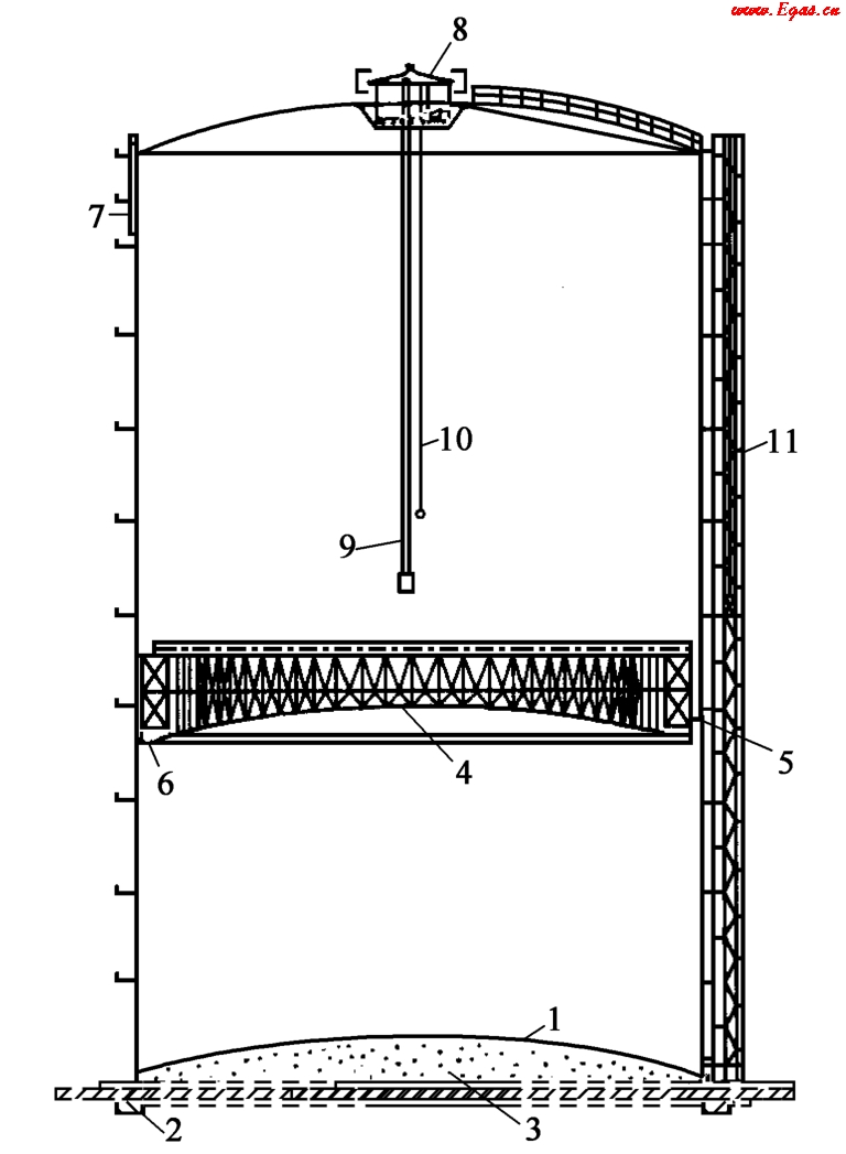 1—底板;2—環(huán)形基礎;3—砂基礎;4—活塞;5—密封墊圈;6—加重塊;7—燃氣放散管;8—換氣裝置;9—內部電梯;10—電梯平衡塊;11—外部電梯