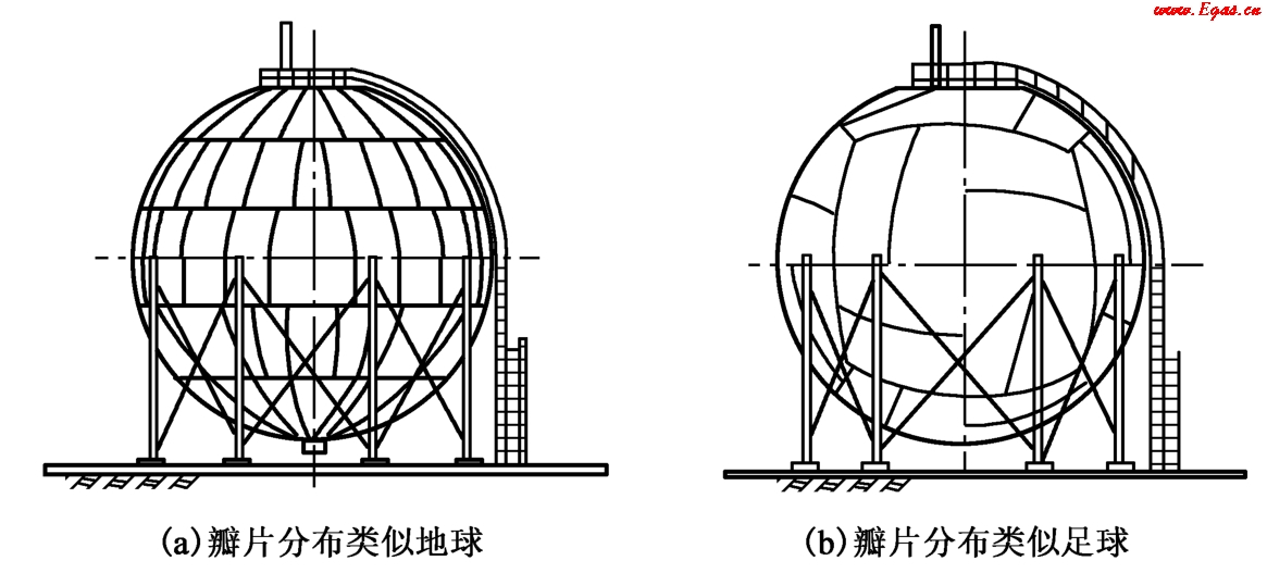 球形罐通常是由用鋼板分瓣壓制的球片拼焊組裝而成。罐的瓣片分布類似地球,一般分為極板、南北極帶、南北溫帶、赤道帶等。罐的瓣片也有類似足球外形的。這兩種球形罐如圖6-5所示。