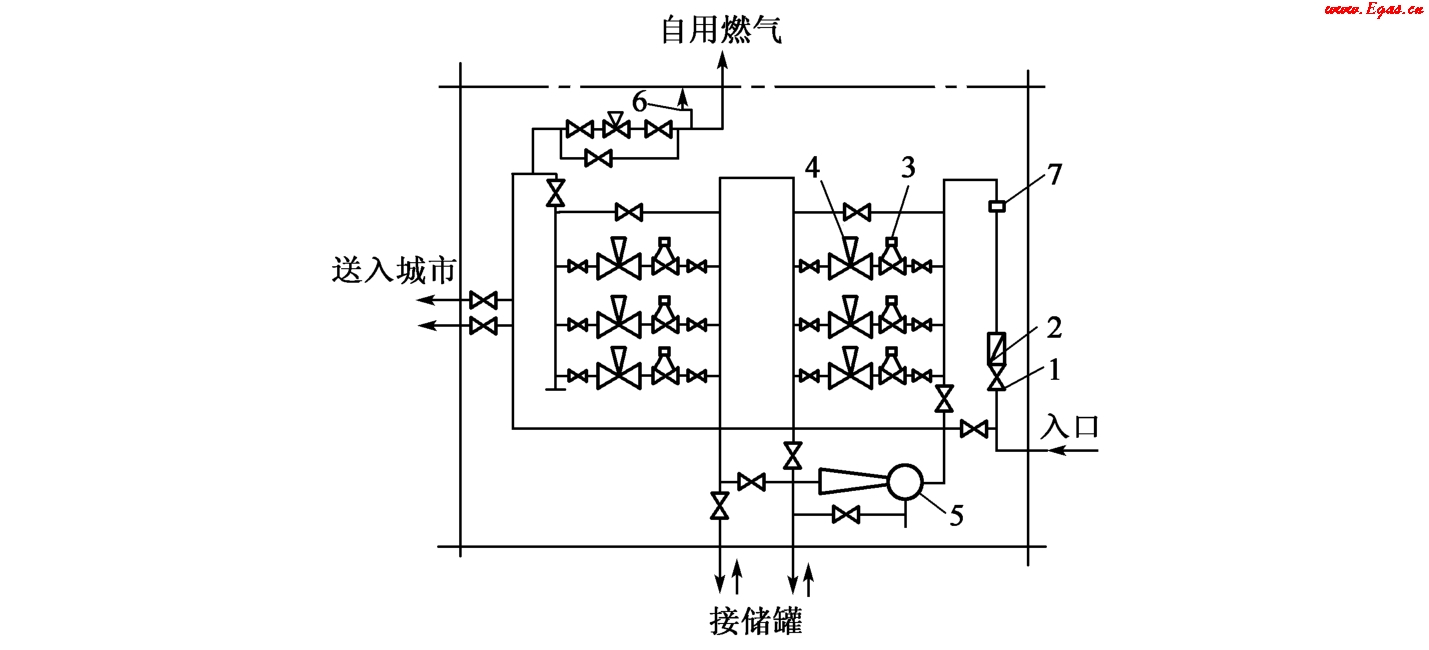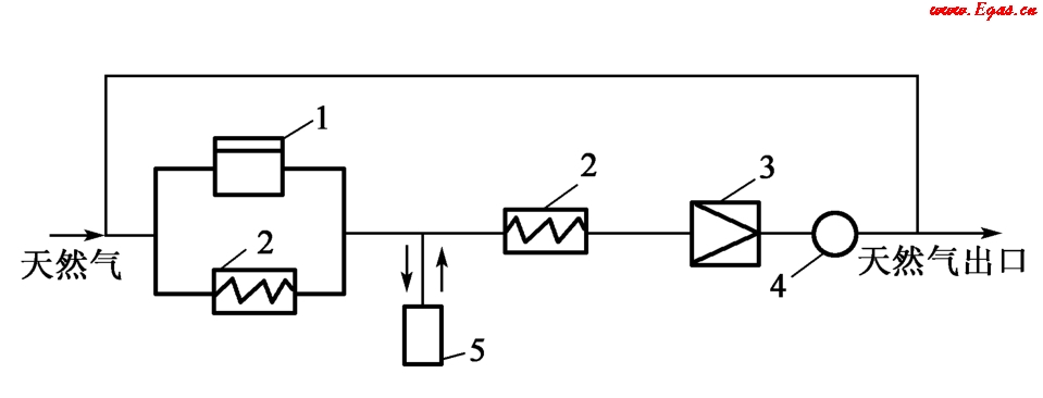 如果長距離輸氣管線的壓力大于儲氣庫的壓力,必要時使天然氣通過預熱器再進入儲氣庫,以防止在壓力突然降低時生成水合物。如果儲氣庫的壓力大于或等于管線壓力,則必須使天然氣經壓縮機加壓,達到需要的壓力后送入儲氣庫,而儲氣庫則靠自身的壓力將天然氣輸出。輸出的天然氣在進調壓器前也需經過預熱器。此外,在儲氣庫工作的第一年,還需要將含水的天然氣進行干燥處理。