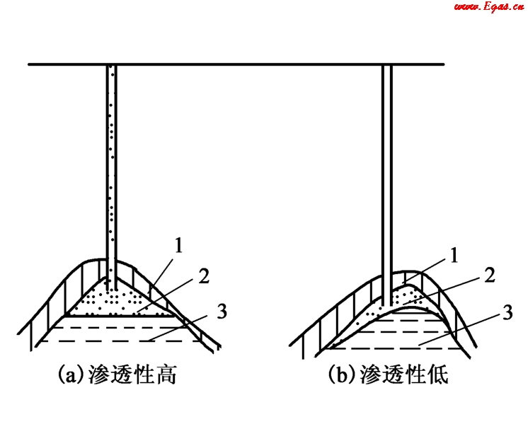 如果儲氣庫滲透性很好,天然氣擴散時水位呈平面形;如滲透性很低,則天然氣擴散時使水位形成一個弧形,如圖6-9所示。對于滲透性高的儲氣庫,在排氣時水能夠很快壓回,還可回收一部分用于注氣的能量。