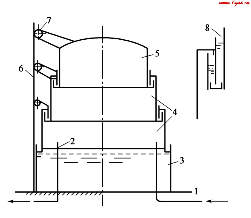 1—進氣管;2—出氣管;3—水槽;4—塔節(jié);5—鐘罩;6—導軌立柱;7—導輪;8—水封