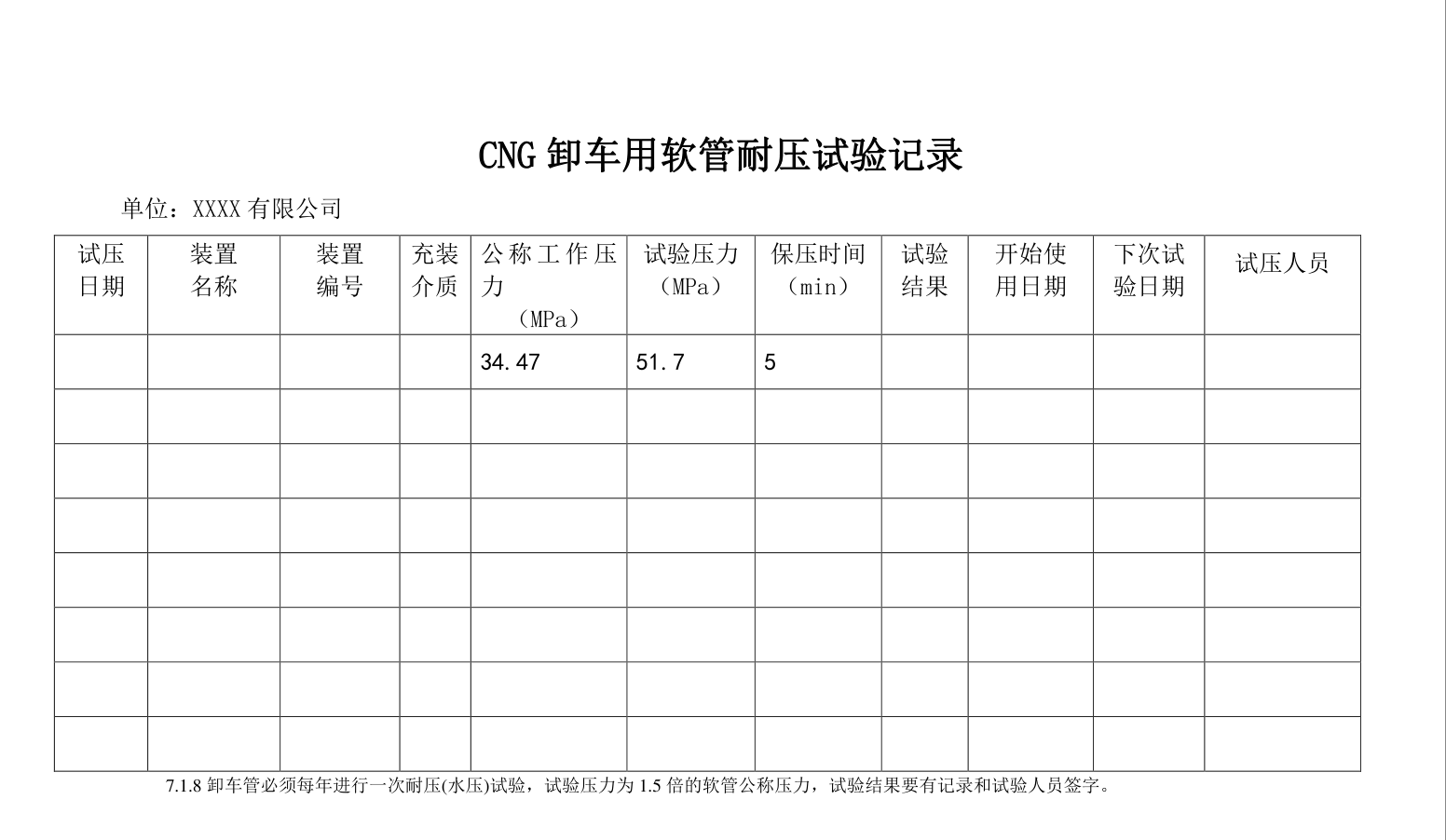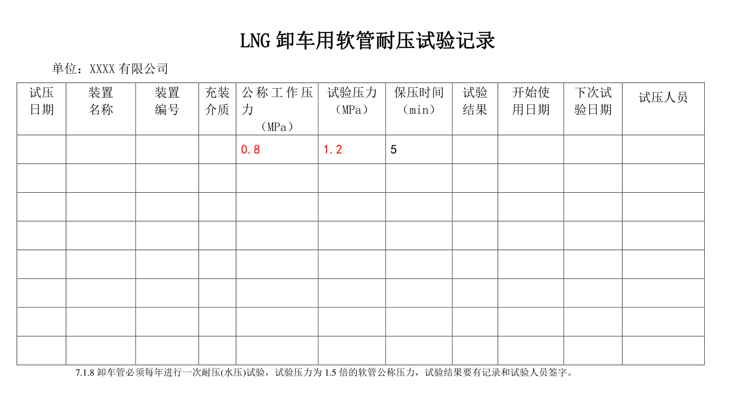 2、 卸車用軟管應當每年進行一次耐壓試驗檢查, 試驗壓力為卸車用軟管公稱壓力的 1. 5 倍(液化天然氣卸車用管試驗壓力為 1. 2MPa);