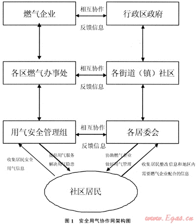 安全用氣協(xié)作網(wǎng)的主體是燃氣企業(yè)的安全用氣管理網(wǎng)絡(luò)和社區(qū)的綜合治理管理網(wǎng)絡(luò)。建立協(xié)作網(wǎng)的目的是要充分利用社區(qū)的地利優(yōu)勢和燃氣企業(yè)的專業(yè)優(yōu)勢,雙管齊下,最大程度地提高居民安全用氣意識和降低用氣事故發(fā)生率。安全用氣協(xié)作網(wǎng)建成后,燃氣企業(yè)的專業(yè)安全用氣管理人員將與社區(qū)干部建立長久的協(xié)作關(guān)系,通過社企雙方齊抓共管,在社區(qū)原有的安全防范管理網(wǎng)絡(luò)的基礎(chǔ)上,逐步形成包含安全用氣管理內(nèi)容在內(nèi)的安全網(wǎng)絡(luò)化管理新模式。