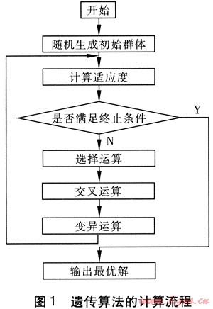 遺傳算法作為一種全局優(yōu)化搜索方法,以其簡單通用、魯棒性強(qiáng)、適于并行處理以及應(yīng)用范圍廣等特點(diǎn),在求解復(fù)雜的工程優(yōu)化問題中取得了良好的效果。它是基于生物進(jìn)化的思想,將優(yōu)化計算中的迭代過程模擬成物種進(jìn)化的過程,形成一種具有“生成+檢驗”特征的搜索算法[5]。它以編碼空間代替問題的參數(shù)空間,以適應(yīng)度函數(shù)為評價依據(jù),以編碼群體為進(jìn)化基礎(chǔ),以對群體中個體位串的遺傳操作實現(xiàn)選擇和遺傳機(jī)制,建立起一個迭代過程,使遺傳算法具有了其他傳統(tǒng)優(yōu)化方法所沒有的特性。遺傳算法的計算流程見圖1。
