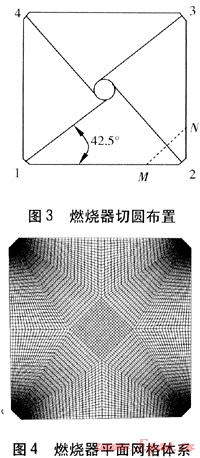燃燒器切圓布置見(jiàn)圖3,從左下角逆時(shí)針旋轉(zhuǎn),燃燒器編號(hào)依次為1~4號(hào)角,1~4號(hào)角射流方向與前墻夾角均為42.5°,圖中虛線MN為計(jì)算結(jié)果分析時(shí)的輔助線。由于四角切圓鍋爐幾何區(qū)域的復(fù)雜性,采用直角坐標(biāo)系進(jìn)行數(shù)值計(jì)算時(shí),其每個(gè)角上的一二次風(fēng)的入口方向與直角坐標(biāo)的網(wǎng)格邊界的夾角約為45°,這就容易產(chǎn)生數(shù)值偽擴(kuò)散[4],影響計(jì)算的準(zhǔn)確性。為減小偽擴(kuò)散,本文采用平面網(wǎng)格體系(見(jiàn)圖4)。爐內(nèi)計(jì)算區(qū)域采用了六面體網(wǎng)格,由圖4可知,燃燒器噴口附近的節(jié)距較小,并呈輻射狀,以適應(yīng)燃燒器射流的發(fā)展,盡可能使流體流動(dòng)方向與網(wǎng)格邊界的夾角遠(yuǎn)離45°,最大限度地以垂直于網(wǎng)格邊界的方向進(jìn)入計(jì)算微元體。
