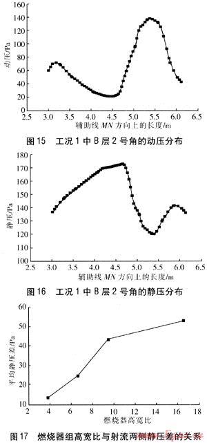 工況1中B層2號(hào)角的動(dòng)壓分布見(jiàn)圖15,在輔助線MN方向上的長(zhǎng)度為5.4m時(shí),動(dòng)壓達(dá)到最大,可以判斷這是燃燒器噴口噴出的射流中心所在的位置。工況1中B層2號(hào)角的靜壓分布見(jiàn)圖16,在輔助線MN方向上的長(zhǎng)度為5.4m的兩側(cè),靜壓分別有兩個(gè)高峰值,這兩個(gè)峰值之差即為燃燒器噴口噴出的射流中心兩側(cè)的靜壓差,約32Pa。通過(guò)此種方法,可以計(jì)算出所有燃燒器射流中心兩側(cè)的靜壓差。各工況燃燒器射流中心兩側(cè)靜壓差平均值見(jiàn)表2,這里的平均靜壓差為各工況下所有燃燒器射流中心兩側(cè)靜壓差的算術(shù)平均值。由表2可知隨著高寬比的增加,燃燒器射流中心兩側(cè)平均靜壓差逐漸增大。