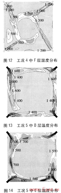 ⑤ 工況5中所有噴口全開(kāi),這時(shí)燃燒器的高寬比達(dá)到16.55。計(jì)算結(jié)果顯示,實(shí)際切圓直徑過(guò)大,氣流從燃燒器噴出后直接沖刷爐壁,由圖13、14可知,燃燒器平面的高溫區(qū)域均在壁面附近,這樣會(huì)在爐壁附近形成還原性氣氛,降低了灰熔點(diǎn),運(yùn)行中容易造成爐壁的結(jié)渣。