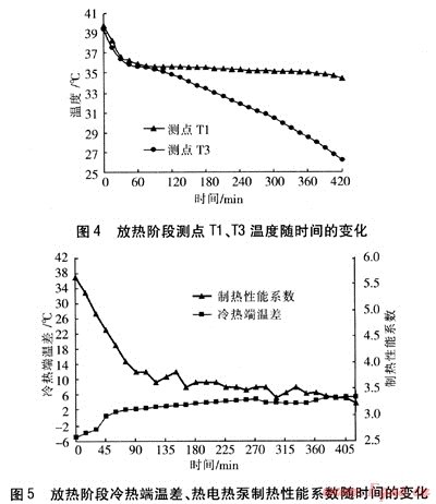 放熱階段冷熱端溫差、熱電熱泵制熱性能系數(shù)隨時間的變化見圖5。