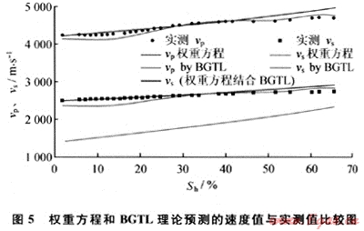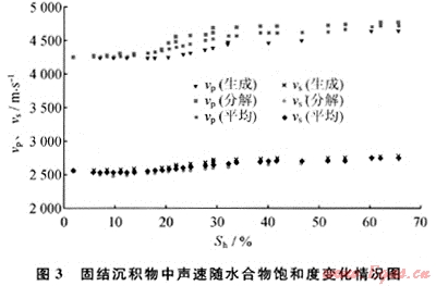 在固結(jié)沉積物實(shí)驗中,筆者發(fā)現(xiàn)低飽和度的水合物(飽和度小于10%)對聲速影響不明顯的現(xiàn)象,這種現(xiàn)象也被不同學(xué)者所捕捉[19~20]。經(jīng)上述分析后認(rèn)為,水合物在沉積物孔隙流體中形成,對聲速影響不大,可能是造成這一現(xiàn)象的原因。而當(dāng)水合物膠結(jié)沉積物顆粒時,其對聲速的影響則可能成倍增長,如在松散沉積物中,微量的水合物(飽和度1%左右)即可使縱波速度增長200~300m/s。可見,在天然氣水合物的資源評價中,了解水合物的微觀分布同樣具有重要的作用。