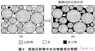 水合物的微觀分布對沉積物內(nèi)氣體運(yùn)移通道具有重要影響:在固結(jié)沉積物中,水合物在飽和度大于30%后膠結(jié)沉積物顆粒,使沉積孔隙中部分流體被“封閉”,得不到氣源的供給而不能進(jìn)一步生成水合物;而在松散沉積物中,大部分水合物因在孔隙流體中生成(只有最初1%飽和度的水合物膠結(jié)沉積物顆粒),未堵塞流體運(yùn)移通道,因此水合物幾乎能完全充填孔隙。
