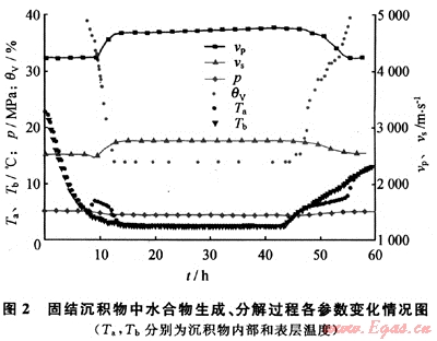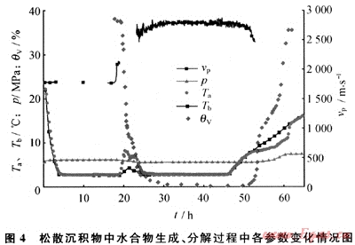 松散沉積物為采自于青島海邊的天然砂,粒徑為0.18~0.25mm,其物質(zhì)成分及含量如表2所示。由于難以探測松散沉積物的橫波速度,本文實(shí)驗僅獲取了縱波速度隨水合物生成和分解的變化情況(圖4)。結(jié)果表明,水合物剛開始生成時,縱波速度有一個陡然增大的現(xiàn)象,隨后由于超聲衰減極大,縱波速度難以獲取[13]。水合物完成生成時,含水合物松散沉積物的縱波速度為278m/s左右,比含飽和水沉積物的聲速增長1000m/s左右。