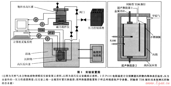 實(shí)驗在青島海洋地質(zhì)研究所水合物實(shí)驗室地球物理模擬實(shí)驗裝置上進(jìn)行,該裝置主要由高壓反應(yīng)釜及內(nèi)筒、溫控系統(tǒng)、壓力控制系統(tǒng)、測試系統(tǒng)(包括超聲探測和時域反射探測)和數(shù)據(jù)采集系統(tǒng)5大功能模塊組成(圖1)。實(shí)驗過程為:在高壓反應(yīng)釜中模擬海底真實(shí)的溫度壓力條件,使水合物在沉積物中形成,同時采用超聲探測技術(shù)和時域反射技術(shù)(TDR,Time Domain Reflectometry)實(shí)時探測全過程中沉積介質(zhì)的聲學(xué)參數(shù)和水合物飽和度。為加快水合物生成進(jìn)程,實(shí)驗采用300mg/L的SDS(十二烷基硫酸鈉)溶液和99.99%甲烷生成水合物。實(shí)驗的詳細(xì)介紹見本文參考文獻(xiàn)[8]、[9]。