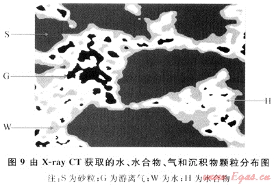 松散沉積物中的水合物微觀分布已由Jin等[18]通過X射線斷層掃描直接觀測(圖9)。結(jié)果表明水合物和沉積物顆粒間由水隔開,即水合物以懸浮狀形態(tài)存在于孔隙流體中,與筆者實(shí)驗中利用聲速所推測的結(jié)果一致。