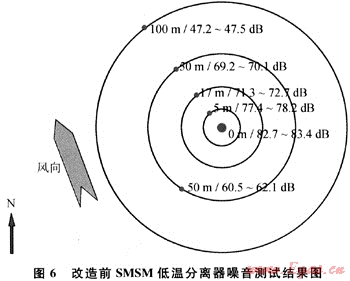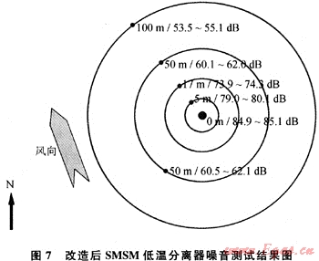 選擇改造前后SMSM低溫分離器處理量最大時、對噪音進(jìn)行測試,結(jié)果見圖6、7。