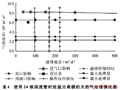 由圖5可知,在壓力為4.0MPa時,44根渦流管的處理量為(410~550)×104m3/d,由此看來造成外輸商品氣氣質(zhì)不合格的主要原因是渦流管的數(shù)量不夠。