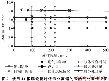 可見在壓力為4.0MPa時24根渦流管的處理量為(220~300)×104m3/a,故外輸商品氣露點不合格的原因是因為渦流管數(shù)量不夠引起的。于是在其他參數(shù)不變的情況下我們又計算了44根渦流管全開時SMSM低溫分離器的處理量,結(jié)果見圖5。