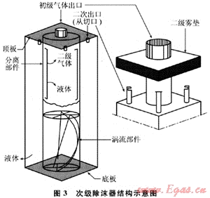 渦流管是一種軸向旋風(fēng)分離器,可對氣、液進(jìn)行分離。渦流管是內(nèi)徑0.11m的不銹鋼管,其進(jìn)口有渦旋式噴嘴,管壁具有縱向切口,氣液通過噴嘴撞擊在管壁上,再通過漩渦氣流產(chǎn)生的離心力,液體被分離,通過切口排放到渦流管外部的液體聚集室里,可以防止液體的再飛散。為了確保渦流管的正常運行,讓一些氣體也通過這些切口滲出,這些氣體通過頂部的二次出口離開液體聚集室后還將通過次級除沫器,氣體的主要部分通過頂部的一次出口離開渦流管。排水管引導(dǎo)聚集在渦流管與渦流板上表面之間的液體流到液面下。