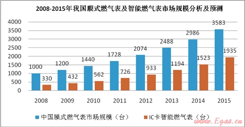 根據(jù)中國計量協(xié)會的相關(guān)數(shù)據(jù),我國目前約有100家燃?xì)獗韽S,2008年總產(chǎn)量為1000萬臺,每年的復(fù)合增長率約為20%。具有中國特色的智能膜式燃?xì)獗恚訧C卡預(yù)付費為主導(dǎo)產(chǎn)品,總量逐年上升,已占膜式燃?xì)獗砜偭康?0%以上。預(yù)計2015年我國燃?xì)獗砜偖a(chǎn)量為3583萬臺,智能燃?xì)獗砜偖a(chǎn)量為1935萬臺。