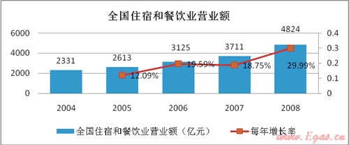 從國家統(tǒng)計局網(wǎng)站上了解到2008年我國從事住宿和餐飲的企業(yè)法人有37151個,全國餐飲業(yè)營業(yè)額已達(dá)到4824億元,每年的復(fù)合增長率達(dá)到20%。